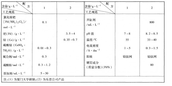 深圳表面處理網:金屬鉆和鎳以及它們的鹽在電極過程中的電化學行為極為相似,下面介紹兩種電鍍鈀鈷合金工藝,見表4-7-9。鈀鈷合金鍍液的配制方法及鍍層的性質與鈀鎳合金類似。